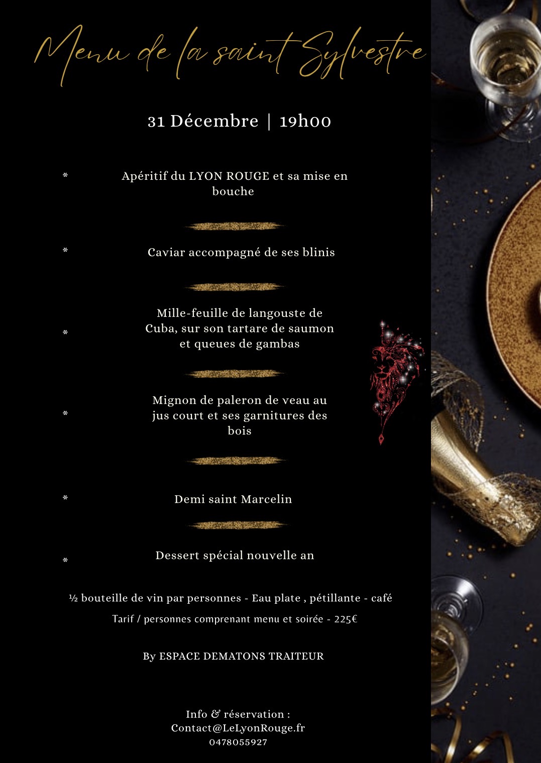 Soirée diner – spectacle Saint Sylvestre au LYON ROUGE Réserver l’événement By booking this event you can attend all occurrences. Some of them are listed below but there might be more. 31-12-2025 Diner- Spectacle 225€ Le déroulé de votre soirée de la Saint Sylvestre Accueil et ouverture des portes du Cabaret LE LYON ROUGE à partir de 19h ** Début des festivités et service de votre dîner prestige à partir de 20h ** Revue Cabaret du LYON ROUGE suivi du décompte de la nouvelle année à minuit ** Soirée dansante jusqu’à 4h du matin ** Des surprises seront à prévoir tout au long de votre soirée Disponible Billets: 74 Le billet de Diner- Spectacle est épuisé. Vous pouvez essayer un autre billet ou une autre date. Suivant Date 31 Déc 2025 Heure 19h00 Tarif 225.00€ Lieu Le Lyon Rouge Brignais (69) Catégorie Dîner - spectacles RESERVEZ ! Partagez cet événement